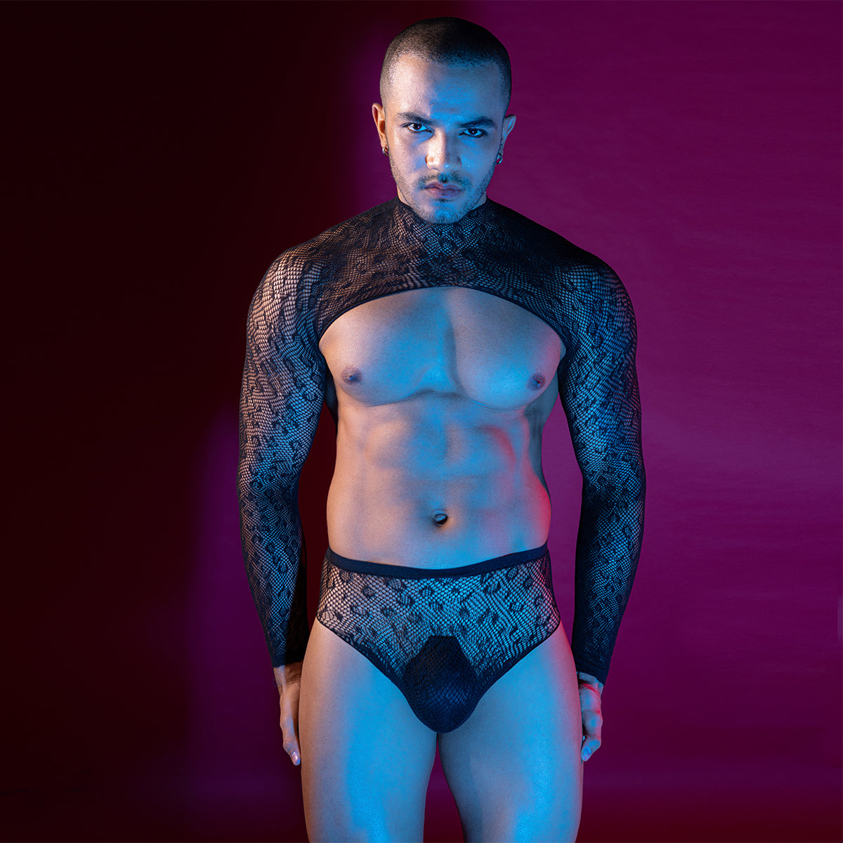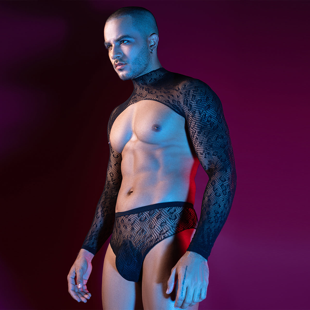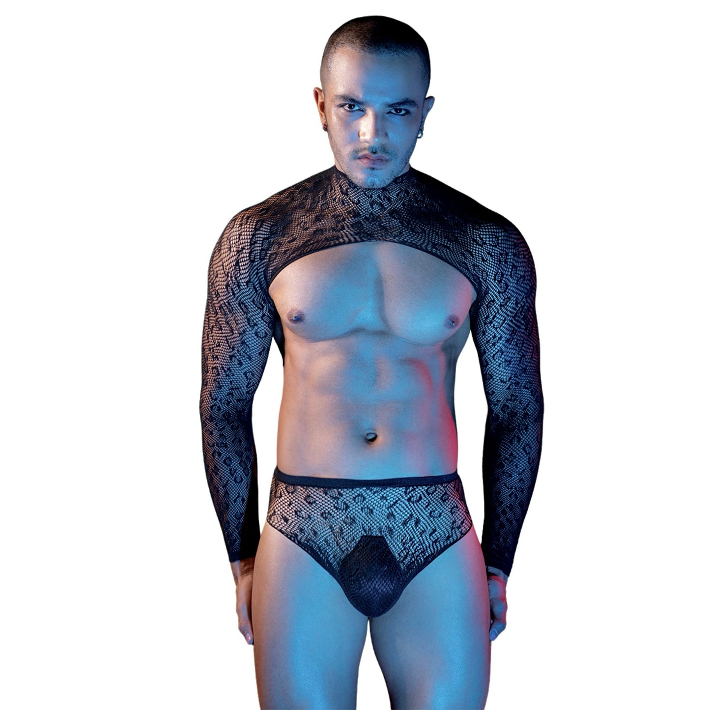 The top features delicate lace detailing that frames the décolletage, while the sheer mesh panels cascade elegantly down the sleeves. Paired with the matching high-waisted leopard print mesh bottoms, this set exudes an air of sophisticated temptation.