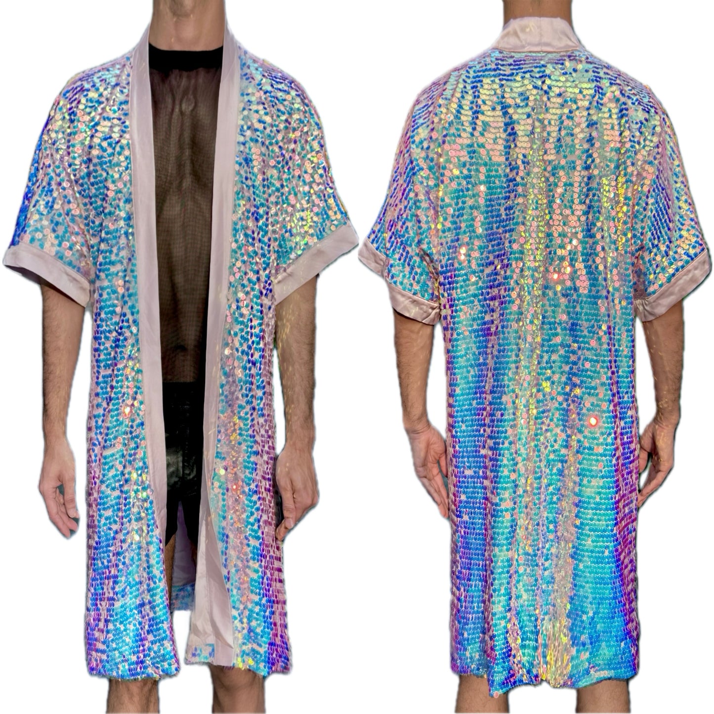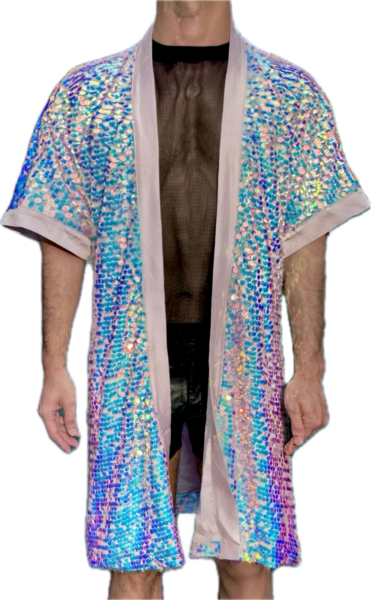 This Ethereal Fusion Kimono boasts a stunning design of pink and blue translucent sequins. The intricate detailing and high-quality material make this piece a must-have for any fashion-forward individual. Enjoy a touch of ethereal elegance with this one-of-a-kind kimono.
