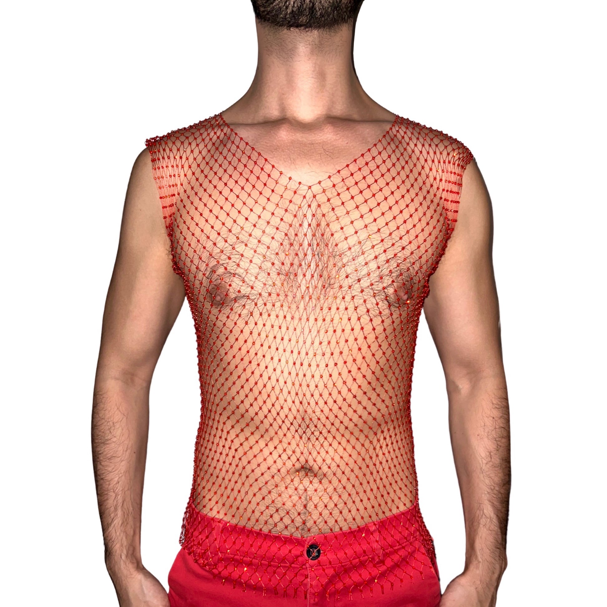 Featuring our Red V Neck Mesh Tank Top with shine-like-diamond top quality rhinestones. This sexy piece will have you subtly sparkling and definitely make you the centre of attention at any festival or party.