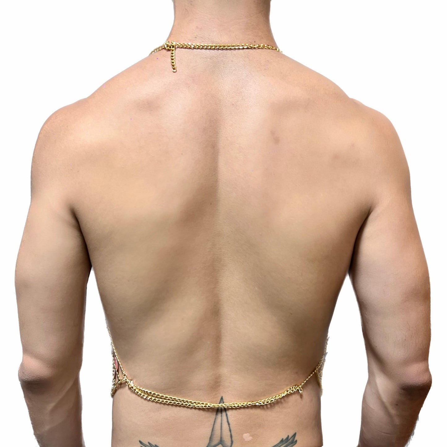 This beautiful body chain is made of delicate, high-quality chains in variety of colors. The chains are connected together to form a draped design that embellishes the body, creating a striking and eye-catching look.