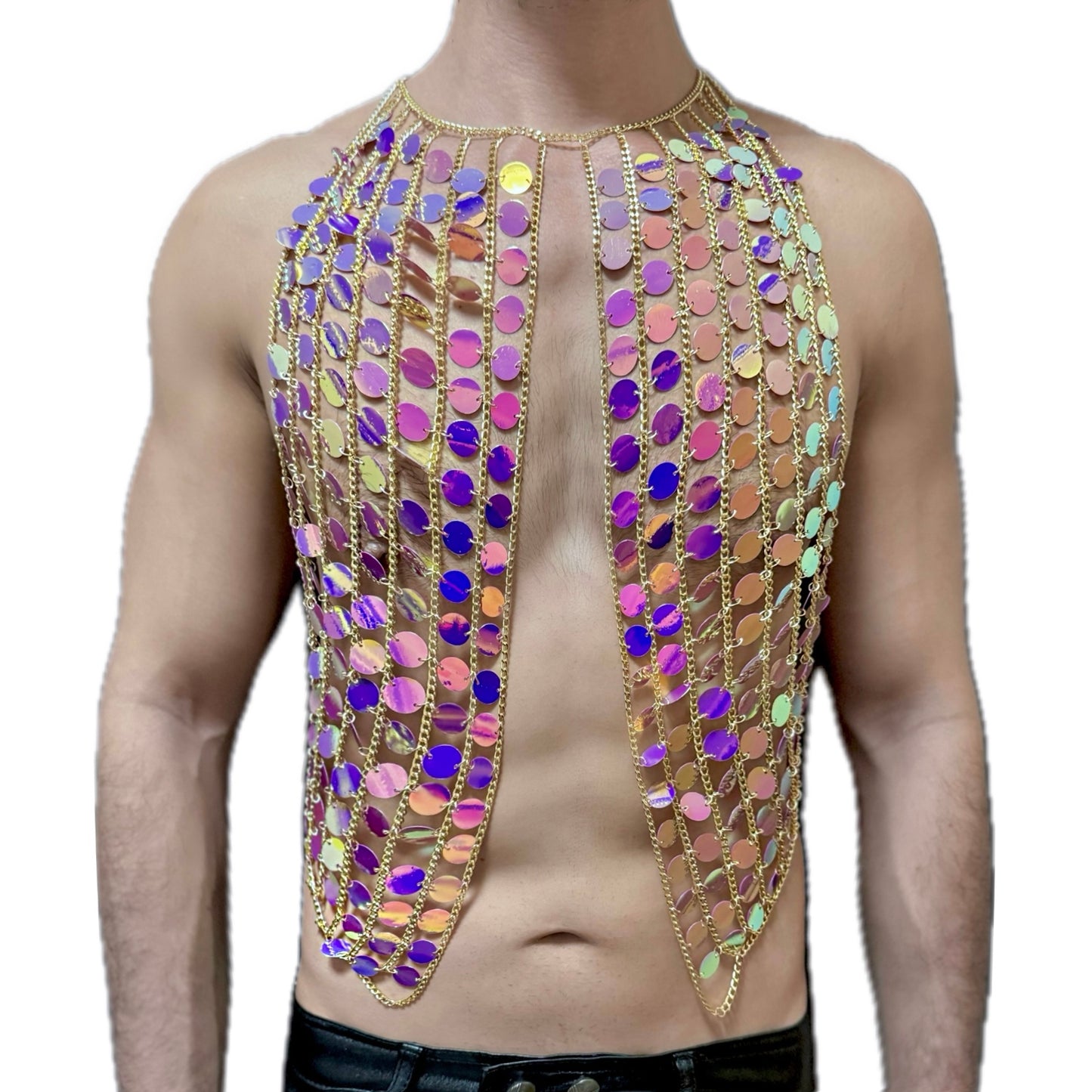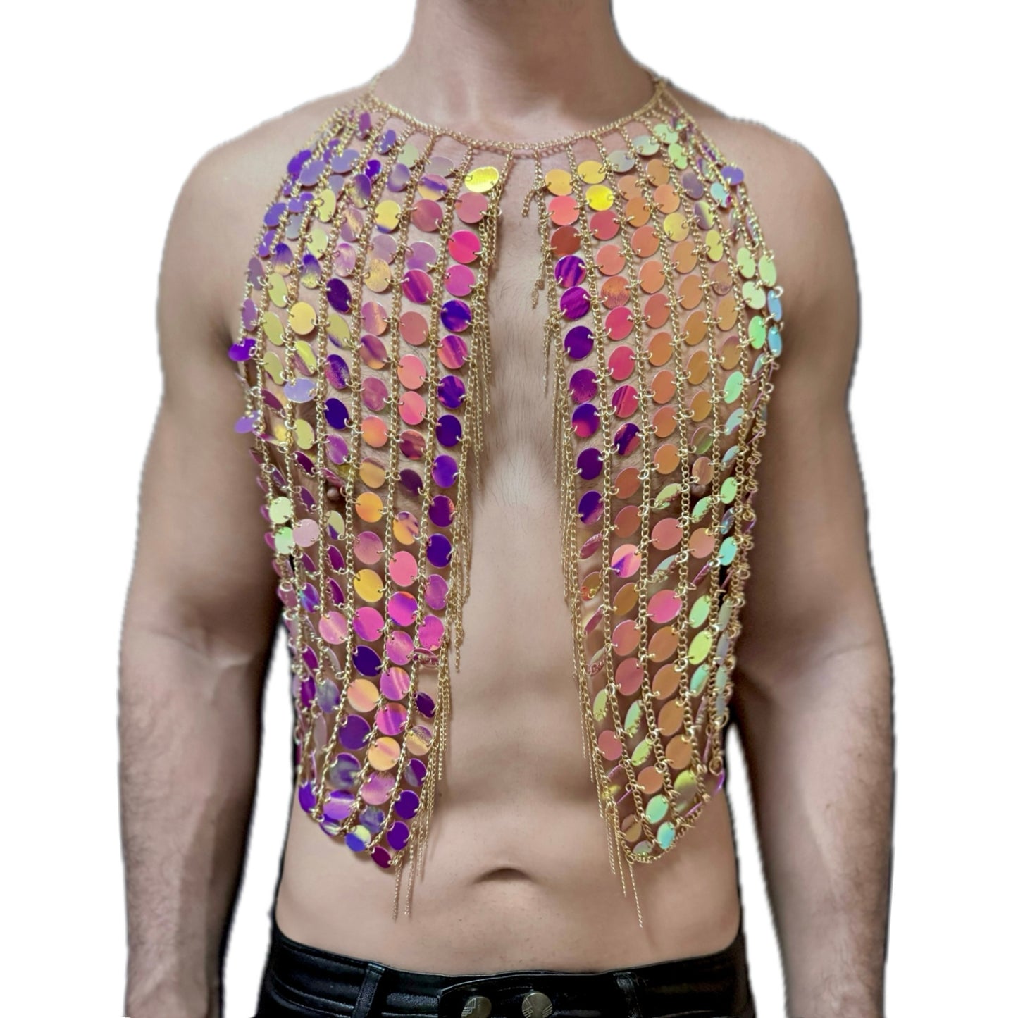 The chains are adorned with small, shiny round sequins that come in a variety of colors. The sequins are made of lightweight materials like plastic or metal, ensuring that the body chain is comfortable to wear all day or night.